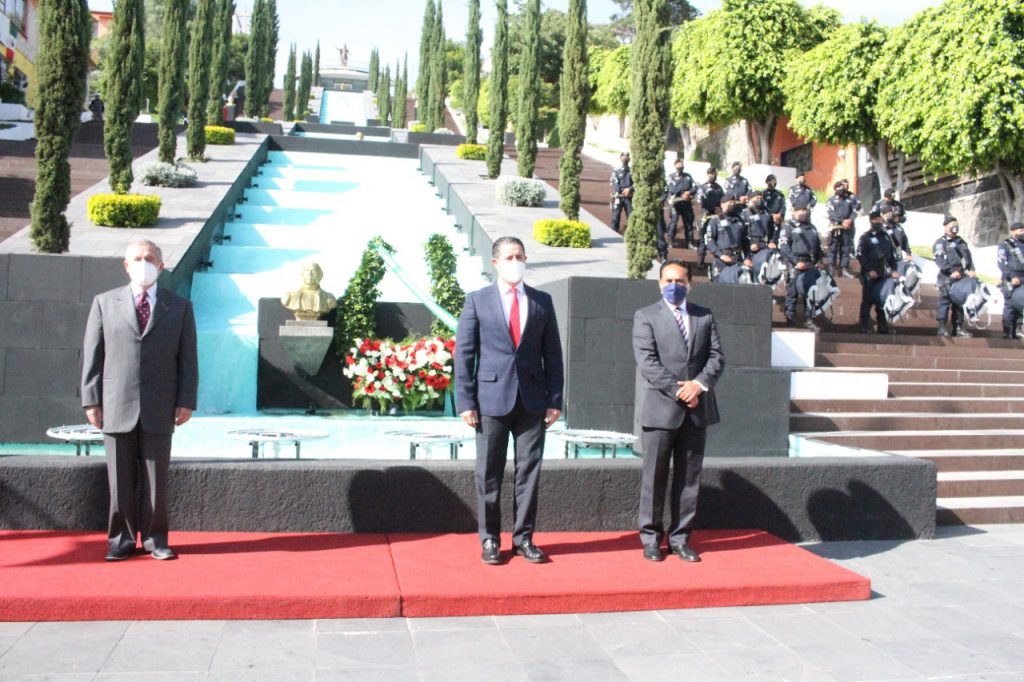 Acompañado de los presidentes del Tribunal Superior de Justicia del estado, Héctor Maldonado Bonilla y municipal de Tlaxcala, Jorge Corichi Fragoso, montó guardia de honor al pie del monumento de Miguel Hidalgo y Costilla.
