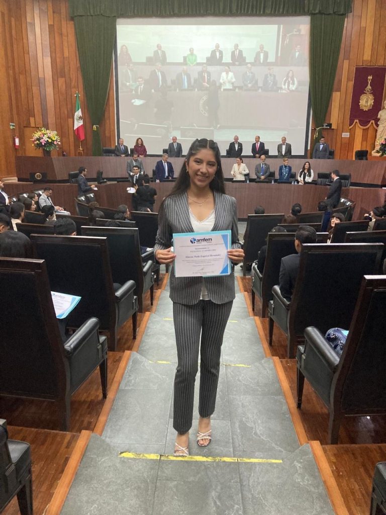 La Asociación Mexicana de Facultades y Escuelas de Medicina entregó un reconocimiento a Ximena Paola Esquivel Hernández, estudiante de 6º semestre de la Licenciatura en Médico Cirujano de la UATx, por ubicarse entre el grupo de estudiantes con mejor promedio de todo el país.