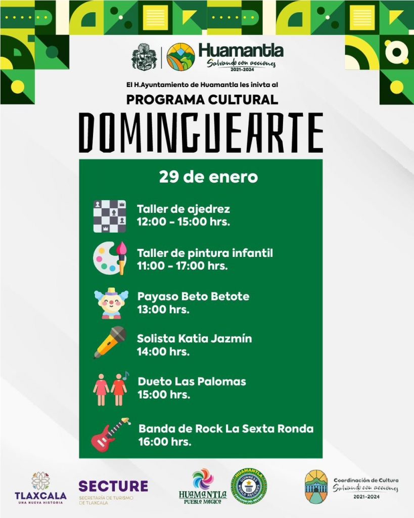La coordinación de Cultura del Ayuntamiento de Huamantla, invita a no perderse cada domingo el escenario principal del programa “Dominguearte”, que ofrece a la ciudadanía una amplia cartelera artística que incluye una gran variedad de presentaciones.