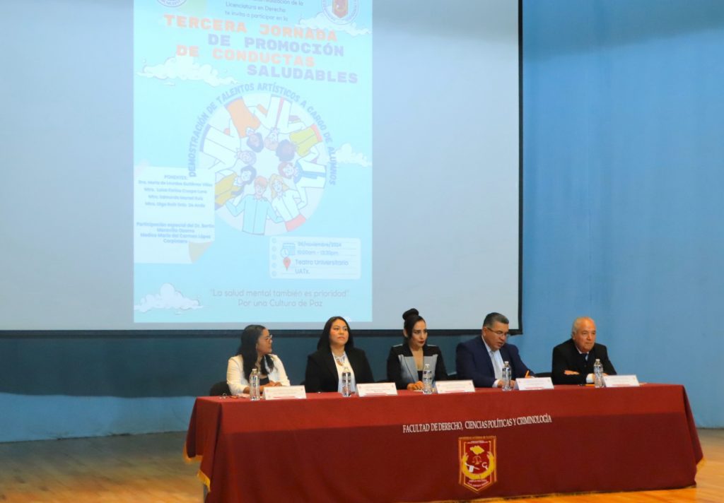 Promover conductas saludables en beneficio de la comunidad estudiantil es un deber de la Universidad Autónoma de Tlaxcala (UATx) porque a través de la educación es posible acceder a recursos adecuados y a entornos de apoyo que contribuyan al bienestar, señaló la Doctora Gloria Ramírez Elías, Secretaría de Autorrealización, en representación del Doctor Serafín Ortiz Ortiz, Rector de esta Casa de Estudios, al inaugurar la “Tercera jornada de promoción de conductas saludables” de la Facultad de Derecho, Ciencias Políticas y Criminología, en el Teatro Universitario.