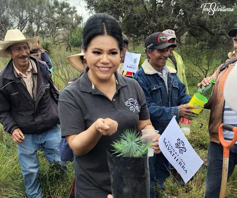 La empresaria Tere Salvatierra preocupada por el medio ambiente participó en actividades de reforestación en la población de Libres Puebla en donde se reforestan más de 800 hectáreas de bosque quemado.