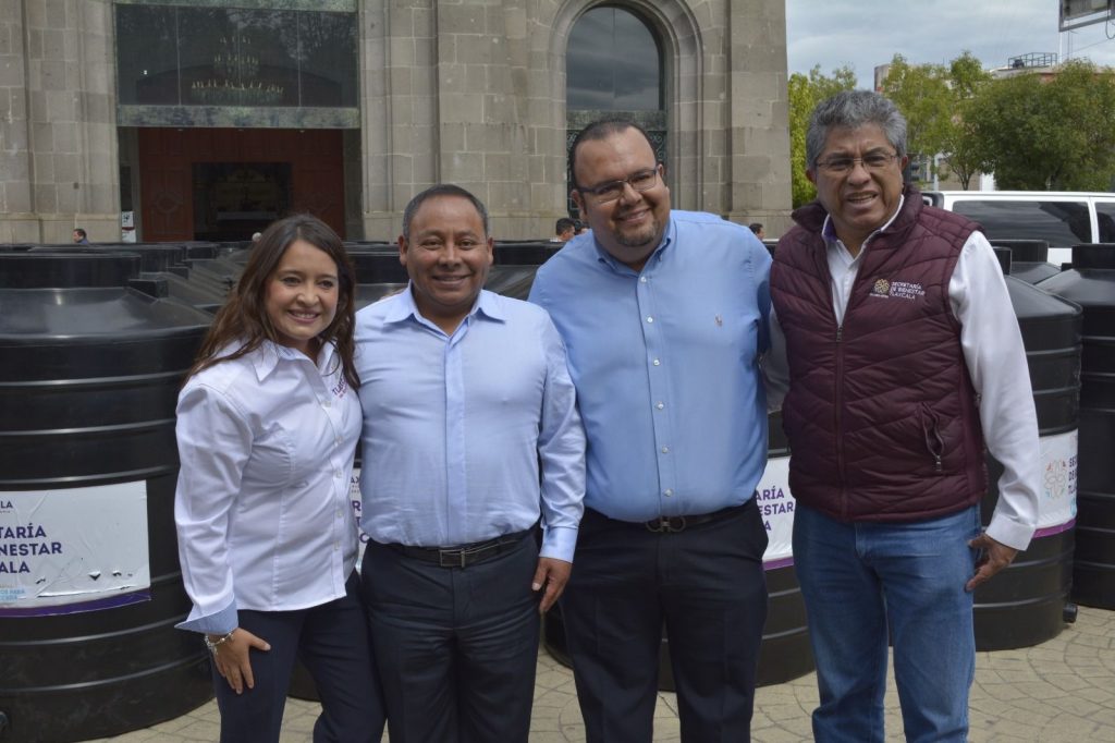 La Licenciada Fernanda Espinosa de los Monteros, Presidenta Honorífica del Comité Consultivo de Bienestar Estatal; el Ingeniero Rubén Espinosa Mejía, Director de Participación Social; el Presidente de Apizaco, Javier Rivera Bonilla, y el Secretario de Ayuntamiento, Juan Pablo Morales Rico; presidieron la entrega de 176 tinacos que beneficiarán a las familias apizaquenses que más lo necesitan para mejorar su calidad de vida.