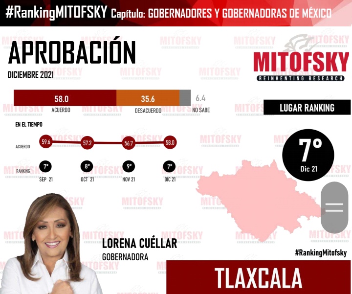 Al cierre del mes de diciembre de 2021, la mandataria estatal Lorena Cuéllar Cisneros se posicionó como la tercera gobernadora del país con la mayor aprobación ciudadana con 58.0 por ciento, en el análisis se incluyeron a las 32 entidades federativas de México, de acuerdo con la casa encuestadora Mitofsky.