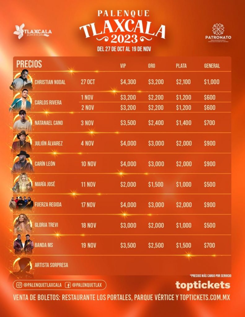 Esta mañana fue presentado el cartel de la variedad del Palenque de Gallos de la Feria Tlaxcala 2023 cuyos boletos oscilan de los 4 mil a 700 pesos, el de mayor costo en zona VIP es de Christian Nodal y el más económico en el área de gradas es de 600 pesos de Carlos Rivera y Natanael Cano.