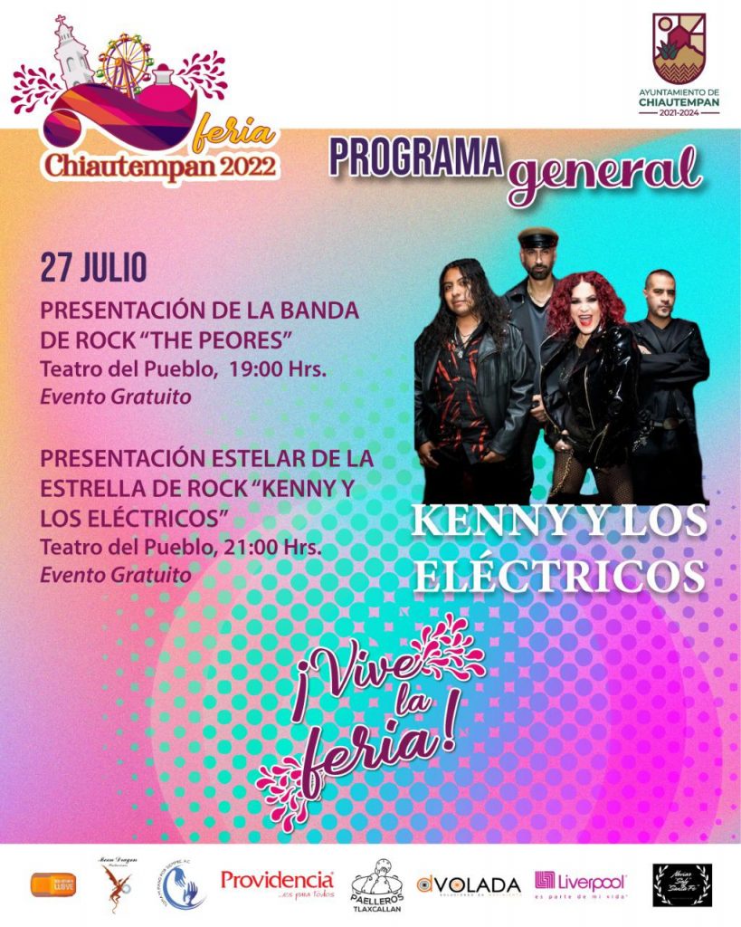Totalmente gratis, en punto de las 21:00 horas, la Feria Chiautempan en su edición 2022 se engalanará con la presentación de la estrella de rock “Kenny y los Eléctricos”.