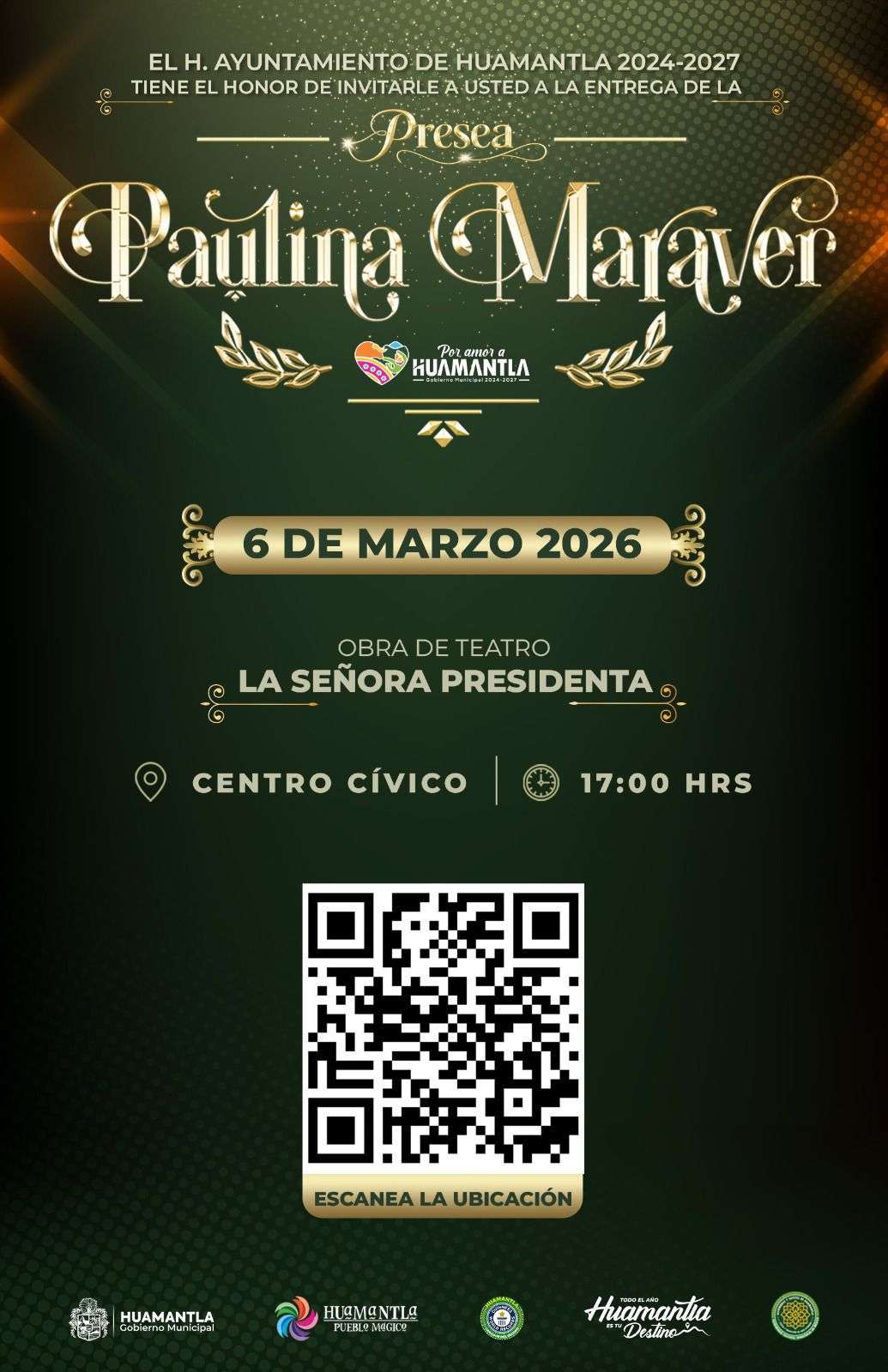 En el marco del Día Internacional de la Mujer, el Gobierno Municipal de Huamantla, que preside Salvador Santos Cedillo, invita a la ciudadanía a conmemorar esta importante fecha con la entrega de la Presea “Paulina Maraver”, un reconocimiento que honra la trayectoria, el esfuerzo y la contribución de la mujer huamantleca que, con su trabajo y dedicación, ha impactado de manera positiva en el bienestar de la comunidad.