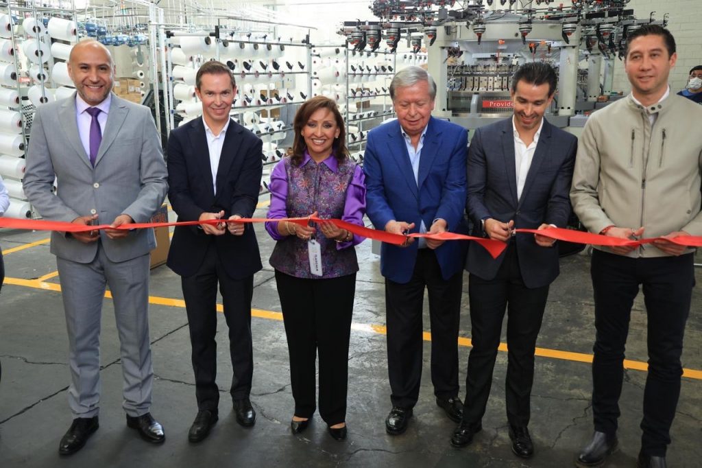 La gobernadora Lorena Cuéllar Cisneros, acompañada de los titulares de las secretarías de Desarrollo Económico (Sedeco), Javier Marroquín Calderón, y del Trabajo y Competitividad (STyC), Noé Altamirano Islas, inauguró la ampliación de la planta de tejido raschel y tejidos especiales del Grupo Textil Providencia.