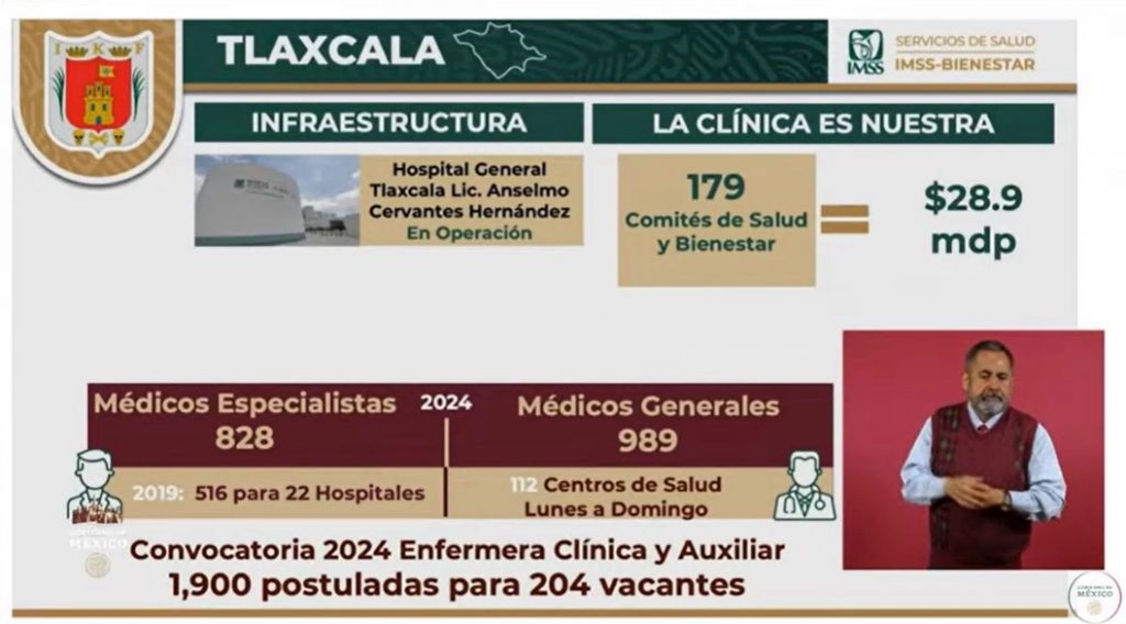 El director general del Instituto Mexicano del Seguro Social (IMSS), Zoé Robledo Aburto, informó que Tlaxcala pasó de 516 a 828 médicos especialistas que se contrataron en hospitales, en el periodo de 2022 a la fecha, con la implementación del sistema de salud IMSS-Bienestar.