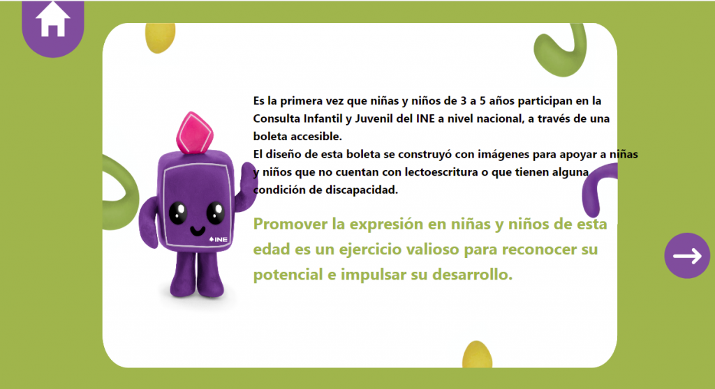 El modo de participación es muy sencillo y con boletas virtuales diseñadas y coloreadas por rango de edad: verde, para el de 3 a 5 años; rosa, para el de 6 a 9 años; morado, para el de 10 a 13 años y amarillo para el de 14 a 17 años. Los temas sobre los que opinarán, y que fueron sugeridospor la población infantil, son: el cuidado del planeta, cuidado y bienestar, así como derechos humanos.
