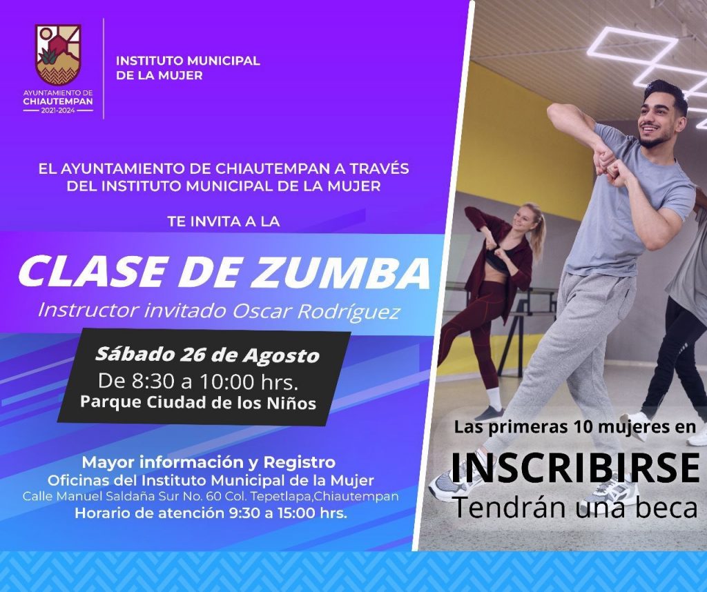 El Ayuntamiento de Chiautempan a través del Instituto Municipal de la Mujer (IMM) invita a mujeres del municipio a inscribirse a la clase de zumba programada para este sábado 26 de agosto.