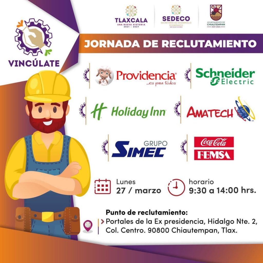 El Ayuntamiento de Chiautempan en coordinación con la Secretaría de Desarrollo Económico (SEDECO) del gobierno del estado, invita a la población a formar parte de la Jornada de reclutamiento que se llevará a cabo el próximo lunes 27 de marzo.