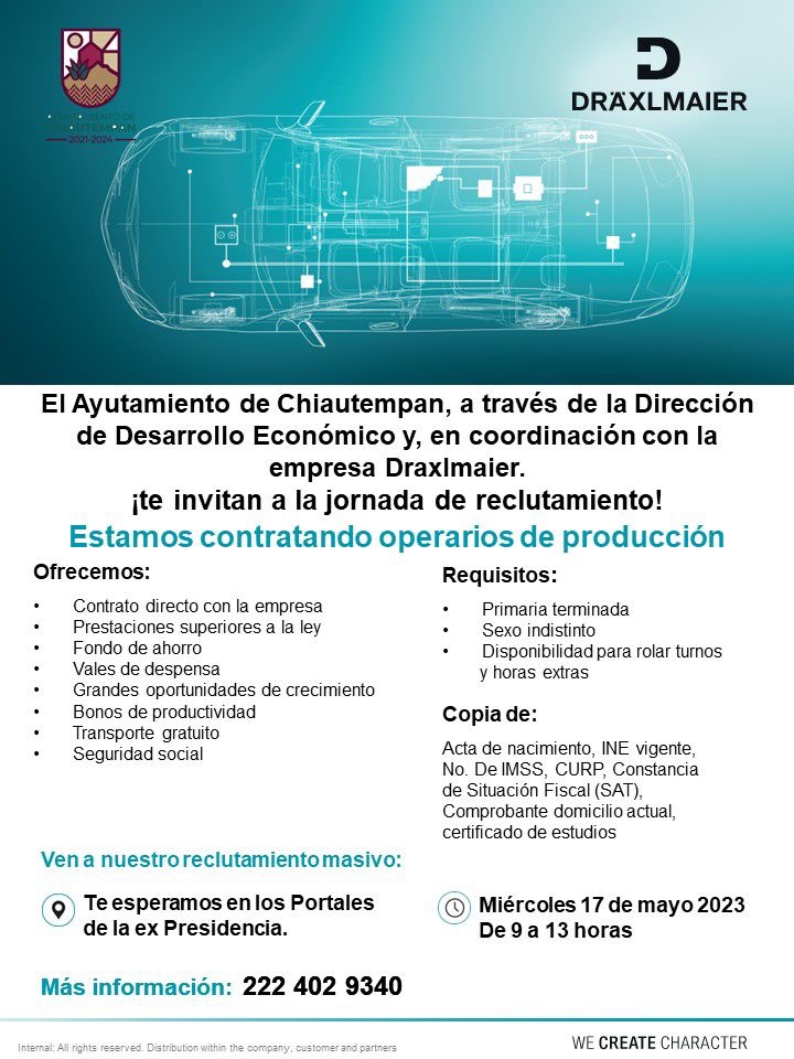 El Ayuntamiento de Chiautempan a través de la Dirección de Desarrollo Económico y en coordinación con la empresa Draxlmaier, invitan a la población a formar parte de la Jornada de reclutamiento de la empresa.