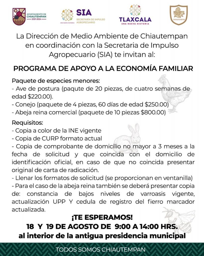 El Ayuntamiento de Chiautempan, a través de la Dirección de Medio Ambiente en coordinación con la Secretaría de Impulso Agropecuario (SIA), invitan a las y los chiautempenses a participar este 18 y 19 de agosto, en el “Programa de Apoyo a la Economía Familiar”, en donde podrán adquirir paquetes de especies menores a bajo costo.