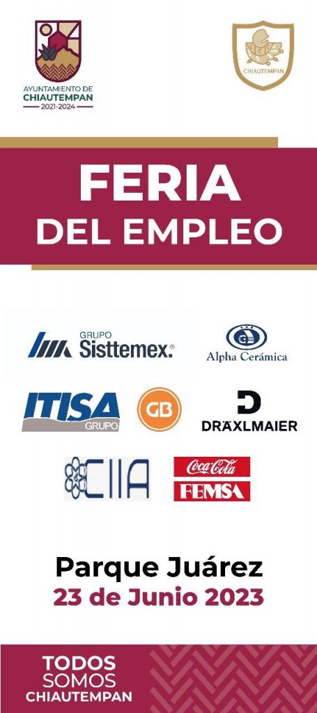 El Ayuntamiento de Chiautempan a través de la Dirección de Desarrollo Económico, invita a la población en general a participar en la Feria Empleo que se llevará a cabo este viernes 23 de junio en el Parque Juárez.
