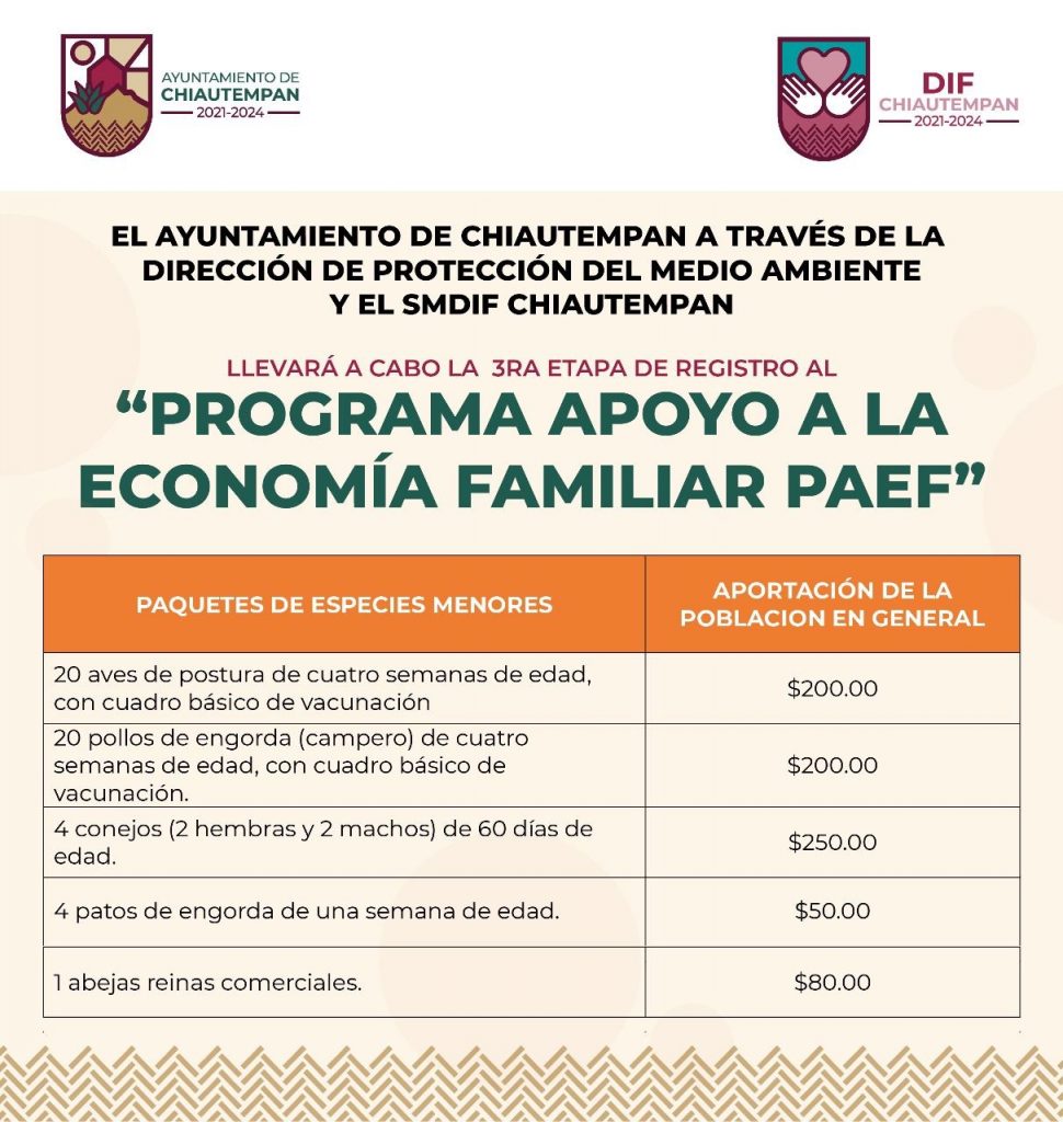 El Ayuntamiento de Chiautempan a través de la Dirección de Protección del Medio Ambiente y el Sistema Municipal para el Desarrollo Integral de la Familia (SMDIF) invita a la población a formar parte de la tercera etapa del registro del Programa de Apoyo a la Economía Familiar (PAEF).