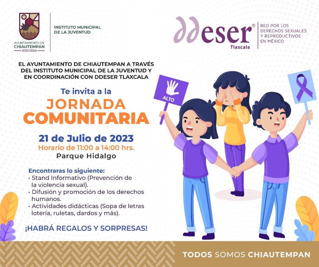 El Ayuntamiento de Chiautempan a través del Instituto Municipal de la Juventud (IMJ) y en coordinación con la Red por los Derechos Sexuales y Reproductivos en México (Ddeser) invitan a los jóvenes chiautempenses a la Jornada comunitaria con temática de salud sexual y reproductiva.