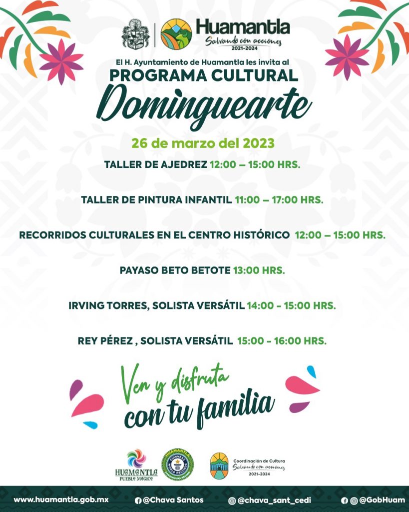 Como cada fin de semana, el H. Ayuntamiento que preside Salvador Santos Cedillo, a través de la Coordinación de Cultura, impulsa cada domingo el programa “Dominguearte”, donde se presenta una cartelera artística y cultural llena de actividades para chicos y grandes.