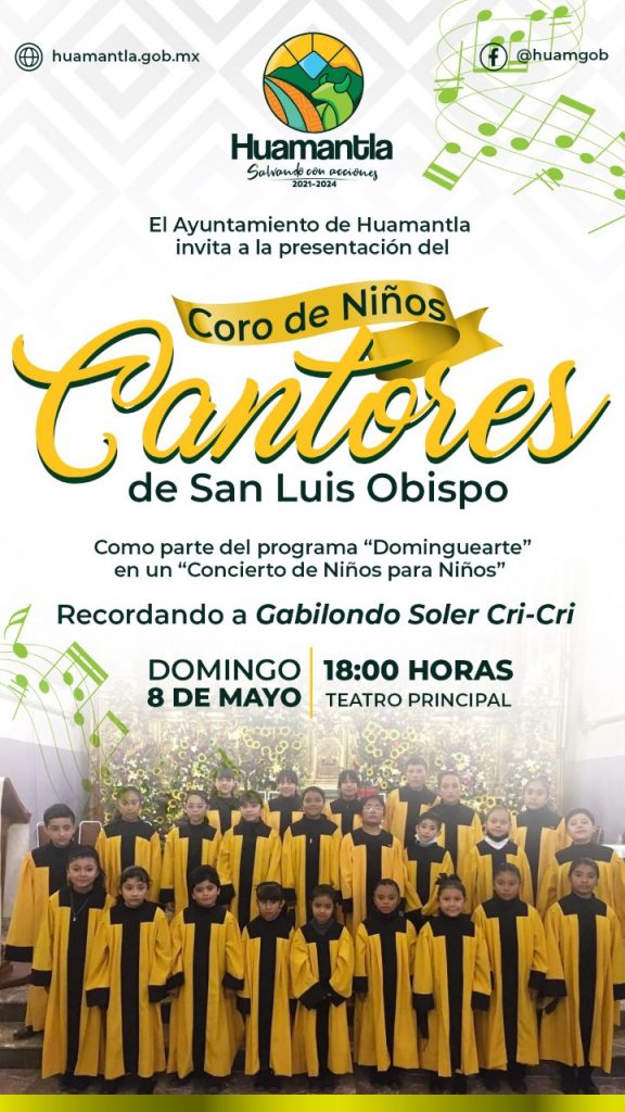 El programa cultural cierra a las 18:00 horas con la magna presentación del grupo de Niños Cantores de San Luis Obispo en un “Concierto de Niños para Niños” en homenaje al cantautor Francisco Gabilondo Soler “Cri-Cri”, que tendrá lugar en el Teatro Principal anexo a la Parroquia de San Luis, en el centro de la ciudad.