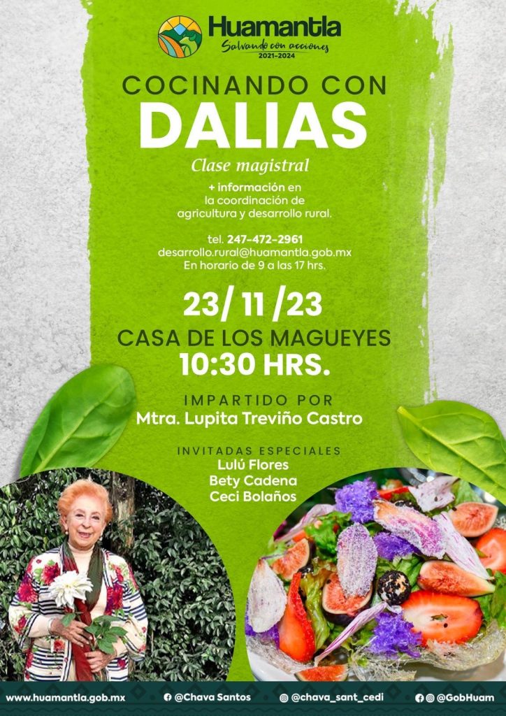 El H. Ayuntamiento de Huamantla, que encabeza Salvador Santos Cedillo, a través de la Coordinación de Agricultura, extiende una cordial invitación a la Clase Magistral «Cocinando con Dalias”, programada para el próximo jueves 23 de noviembre a las 10:30 horas.