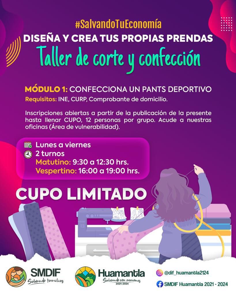 Con el propósito de apoyar la economía de las familias a través de la confección de ropa, el Sistema Municipal para el Desarrollo Integral de la Familia (DIF) Huamantla, invita a la ciudadanía en general a participar en el Taller de Corte y Confección.