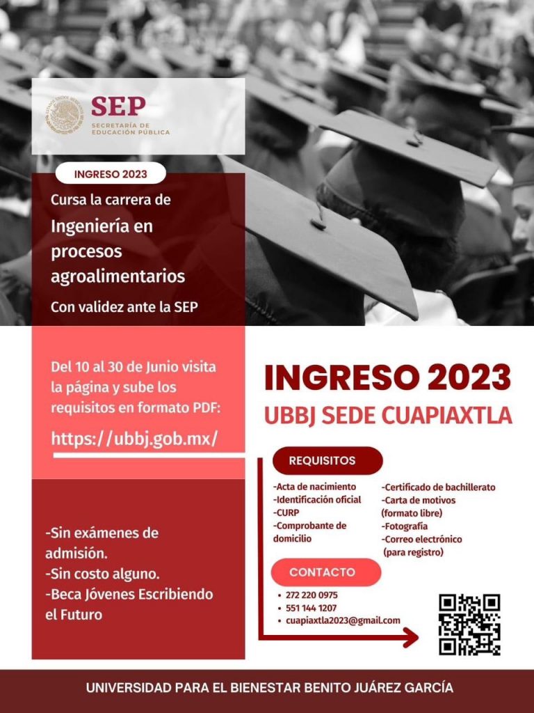 Con base en el convenio de colaboración entre el H. Ayuntamiento de Huamantla y el organismo coordinador de las Universidades para el Bienestar Benito Juárez, en el que se acuerda la difusion de planes y programas de la institución, invitan a los estudiantes que hayan terminado su educación Media Superior a inscribirse a la carrera de Ingeniería en Procesos Agroalimentarios, con sede en el municipio de Cuapiaxtla.