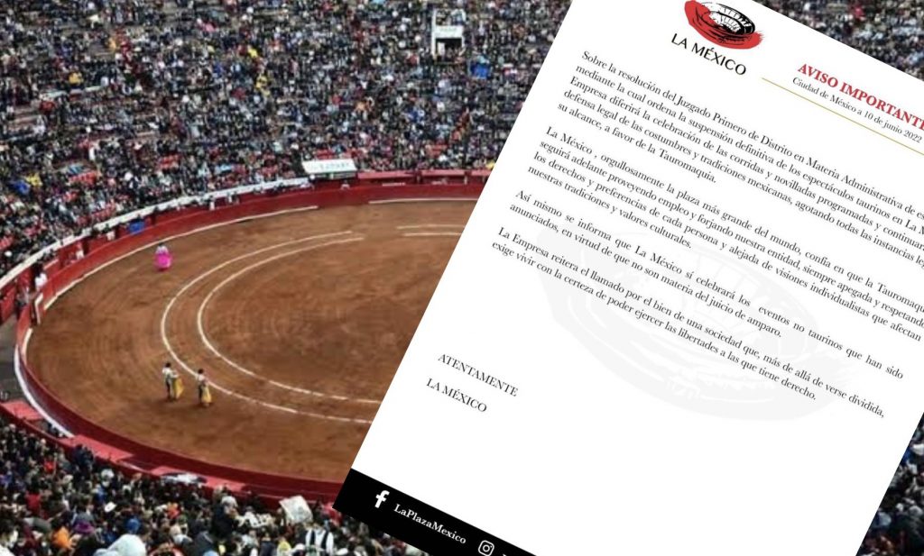 La Plaza México, en un comunicado oficial emitido este viernes, ya anunció que “la empresa diferirá la celebración de las corridas y novilladas programadas y continuará con la defensa legal de las costumbres y tradiciones mexicanas, agotando todas las instancias legales a su alcance, a favor de la tauromaquia”.