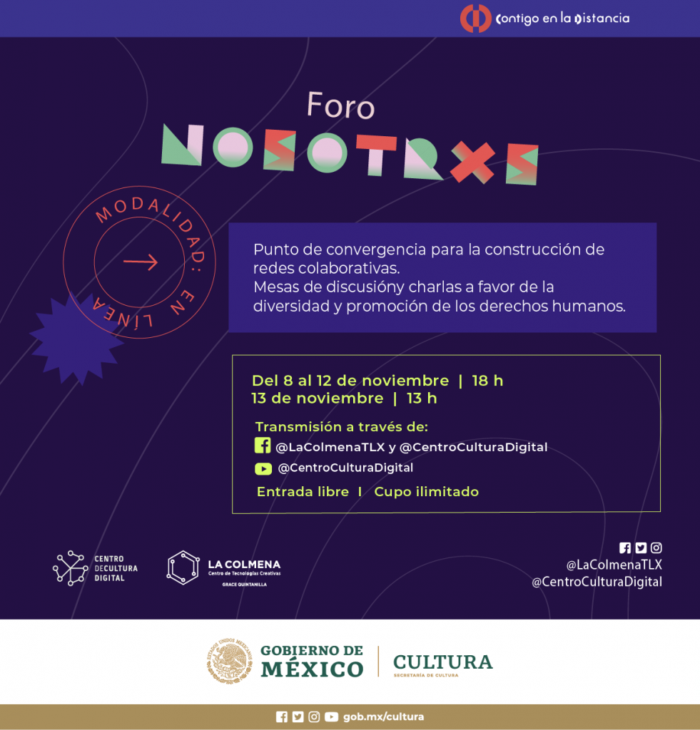 La Secretaría de Cultura del Gobierno de México, a través de La Colmena, Centro de Tecnologías Creativas, Grace Quintanilla y el Centro de Cultura Digital (CCD), organiza a partir del lunes 8 y hasta el 13 de noviembre la segunda edición del “Foro Nosotrxs: voces, miradas, análisis y diálogos diversos”, conformado por una serie de charlas en línea y la presentación de una pieza sonora.