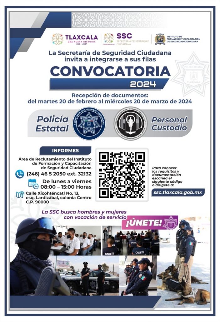 Con el objetivo de formar más y mejores policías que garanticen la protección y seguridad de la población tlaxcalteca, la Secretaría de Seguridad Ciudadana (SSC) invita a mujeres y hombres interesados a participar en el proceso de selección e ingreso a la Policía Estatal y Personal Custodio, para desarrollarse en el ámbito policial con responsabilidad, disciplina y dedicación.
