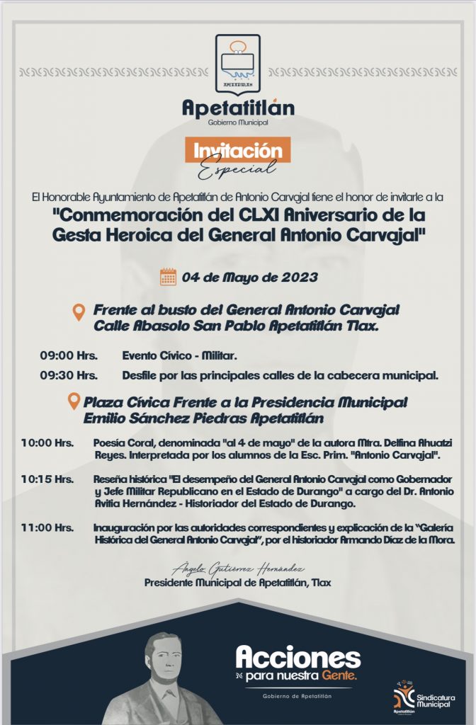 El Ayuntamiento de Apetatitlán de Antonio Carvajal, que preside el panista Ángelo Gutiérrez Hernández invita a toda la población de este municipio y de todas las Comunas aledañas, a la conmemoración del aniversario de la CLXI Gesta Heroica del General Antonio Carvajal, que se realizará este 4 de mayo.