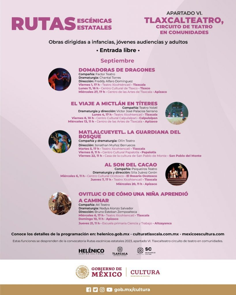 Las obras de teatro se realizarán en el Centro Cultural de Tlaxco, Juárez número 8 Centro Tlaxco; Centro Cultural de Papalotla, Calle Progreso número2 esq. Con potrero, Centro Papalotla Tlaxcala; Atltzayanca, escuela primaria “Ciencia y Trabajo, San Antonio Atltzayanca; Centro Cultural de Calpulalpan, Calle Xicoténcatl número 12 Centro Calpulalpan Tlaxcala; Centro de las Artes Apizaco, Calle Fernando Solana número 1 San Luis Apizaquito; San Pablo del Monte Calle Pablo Sidar Sur número 4 Col Centro San pablo del Monte Tlaxcala; Centro Cultural Ocotoxco, De los maestros SN El Rosario Ocotoxco Tlaxcala; y en el Teatro Xicoténcatl. Juárez número 21 Col Centro Tlaxcala.