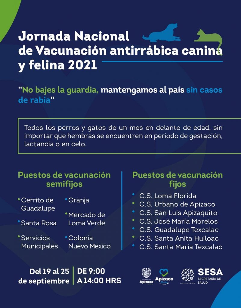 El Gobierno Municipal de Apizaco informó que del próximo domingo 19 al 25 de septiembre, de 9 am a 2 pm, se llevará a cabo la Jornada Nacional de vacunación antirrábica canina y felina 2021, “no bajes la guardia, mantengamos al país sin casos de rabia”