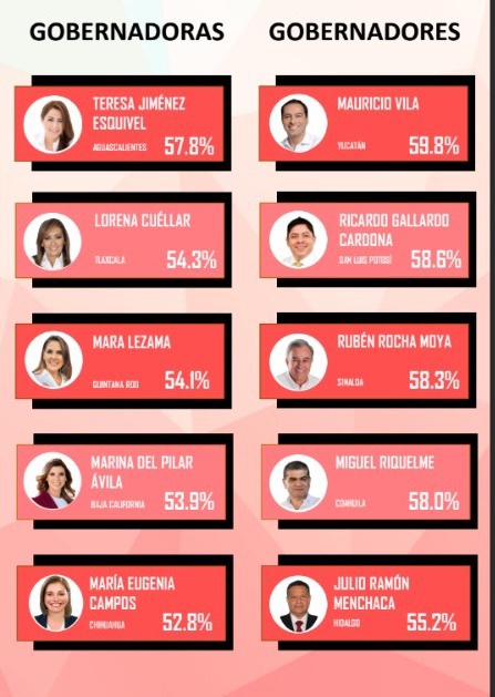 Los resultados “Aprobación ciudadana, Gobernadoras y Gobernadores de México” (septiembre 2023), reflejan que la aprobación promedio se mantiene dentro de los primeros 10 lugares con más del 50 por ciento, lo que coloca a Cuéllar Cisneros por arriba de la media con la que fueron calificados la mayoría de sus homólogos.