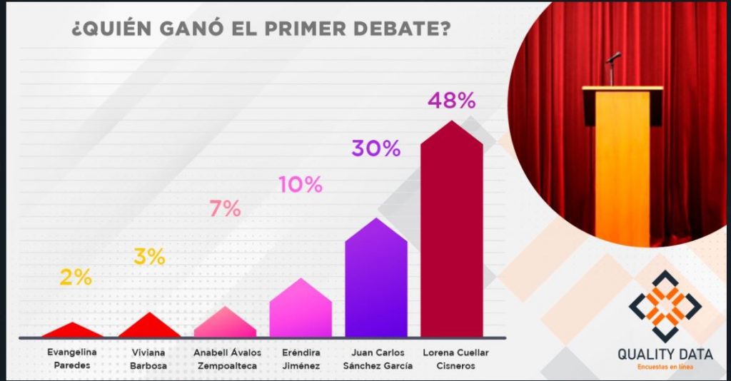 La empresa Quality Data hizo circular en diferentes grupos de mensajería y en redes sociales una encuesta que también de manera telefónica realizó una vez terminado este primer debate, según la grafica que presenta, Lorena Cuellar con el 48 por ciento fue la ganadora de este ejercicio realizado a practicamente 15 días de haberse iniciado las campañas, en tanto que Anabell Ávalos se quedó con el segundo lugar alcanzando el 30%.