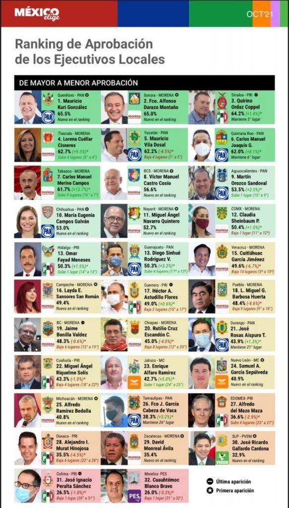 Cuéllar Cisneros se encuentra a menos de tres puntos del gobernador de Querétaro, Mauricio Kuri González, quien encabeza el ranking con el 65.5 por ciento de aprobación, seguido por sus homólogos de Sonora, Alfonso Durazo Montaño y de Sinaloa Quirino Ordaz Coppel con el 65 y 64.2 por ciento de aprobación, respectivamente.