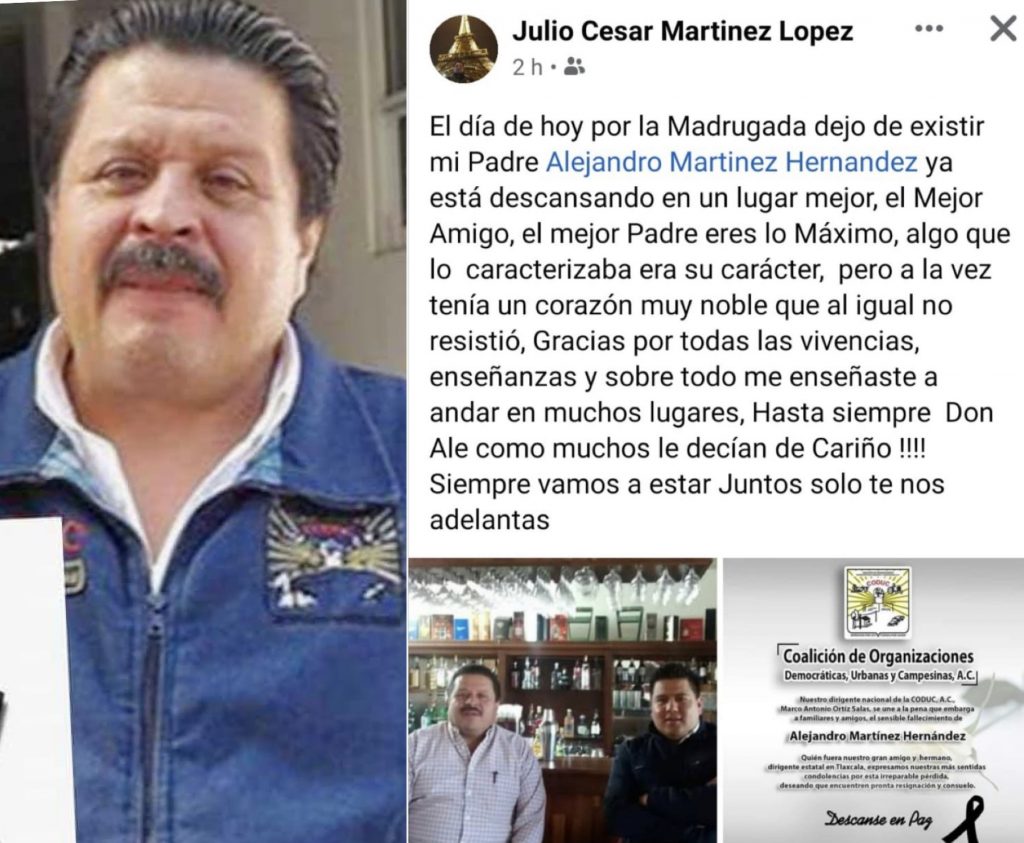 “El día de hoy por la madrugada dejó de existir mi Padre Alejandro Martínez Hernandez, ya está descansando en un lugar mejor. El mejor Amigo, el mejor padre eres lo Máximo”.