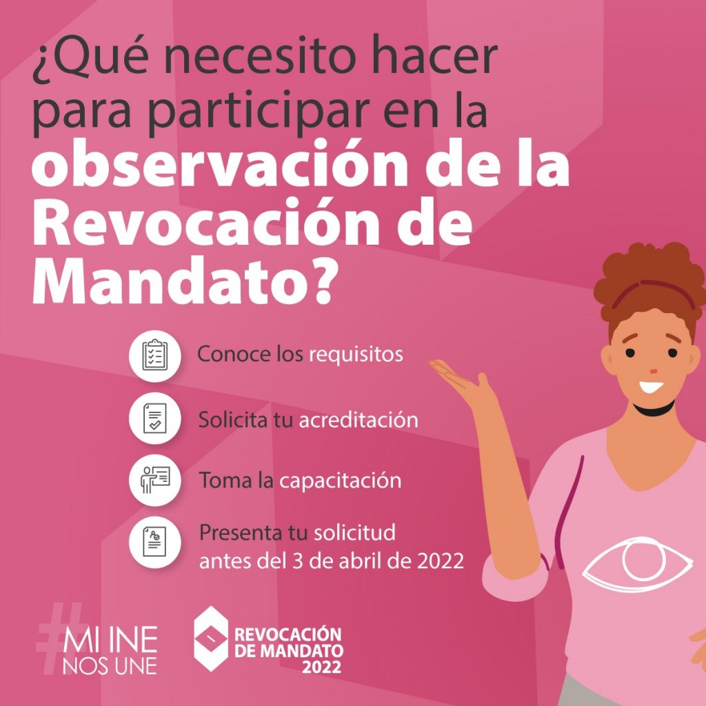 Enlistó también que las y los interesados no deberán haber sido designados o designadas para integrar las Mesas Directivas de Casilla; no podrán actuar de manera simultánea como representantes de partido político ante las casillas o generales, una vez que hayan sido acreditados personas observadoras de la Revocación de Mandato.