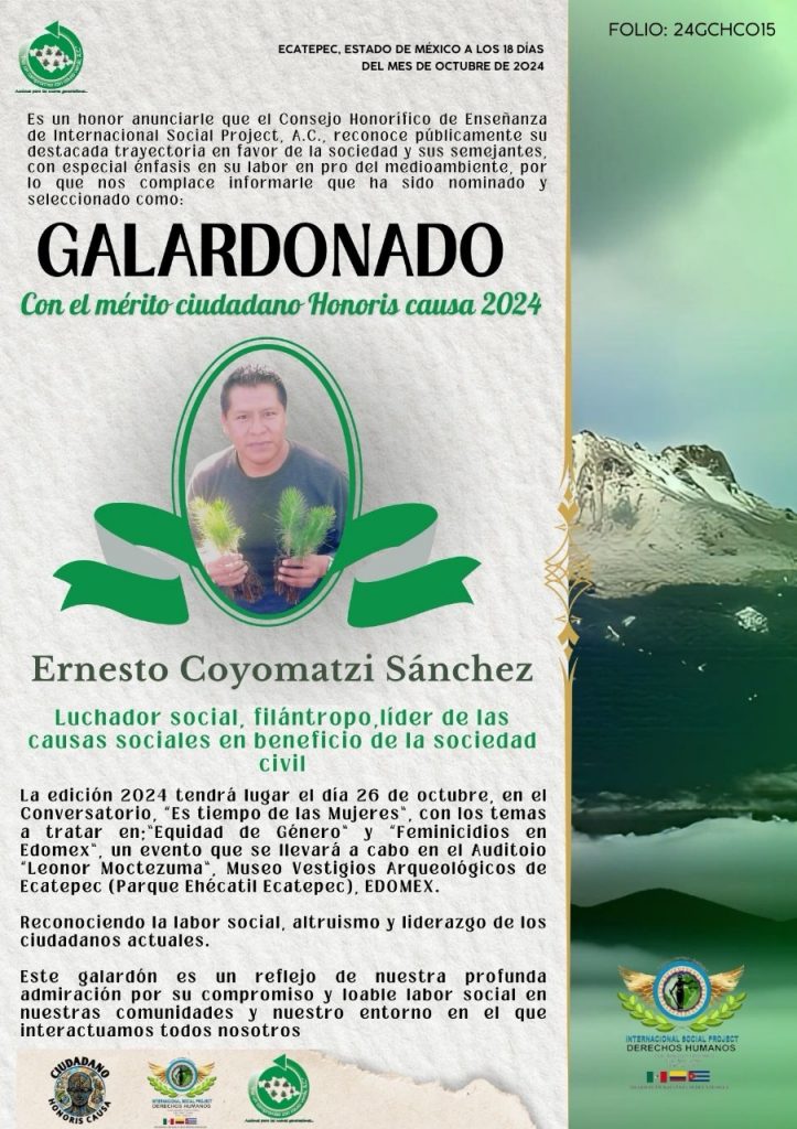 El Consejo Diplomático Honorífico de Enseñanza de Internacional Social Project, con sede en Ecatepec, decidió torgar en su quinta edición el galardón denominado, «Ciudadano Honoris Causa», al ciudadano tlaxcalteca Ernesto Coyomatzi Sánchez, como una forma de reconocer su trayectoria social en beneficio de sus semejantes, así como de su filántropia y activismo.