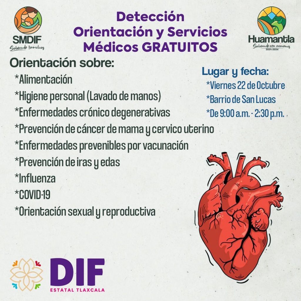 Huamantla, Tlax.- En el marco del 487 Aniversario de la Fundación de Huamantla, el Sistema DIF Municipal de Huamantla a través de su Presidenta Honorífica Karla Menéndez Cedillo, invita a toda la población a que este 22 de octubre se sumen a la campaña de detección, orientación y servicios médicos gratuitos.