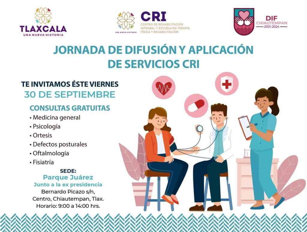 Con el propósito de fomentar una cultura de prevención y atención primaria, el Ayuntamiento de Chiautempan a través del Sistema Municipal para el Desarrollo Integral de la Familia (SMDIF) en coordinación con el Centro de Rehabilitación Integral y Escuela en Terapia Física y Rehabilitación (CRI) otorgarán, este viernes 30 de septiembre, consultas gratuitas en medicina general, psicología, ortesis, defectos postulares, oftalmología y fisiatría.