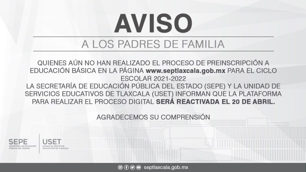 La Secretaría de Educación Pública del Estado (SEPE) y la Unidad de Servicios Educativos de Tlaxcala (USET) informan a los padres de familia o tutores, quienes aún no han realizado el proceso de preinscripción a educación básica en la página www.septlaxcala.gob.mx, que la plataforma para realizar el proceso digital será reactivada el día 20 de abril.