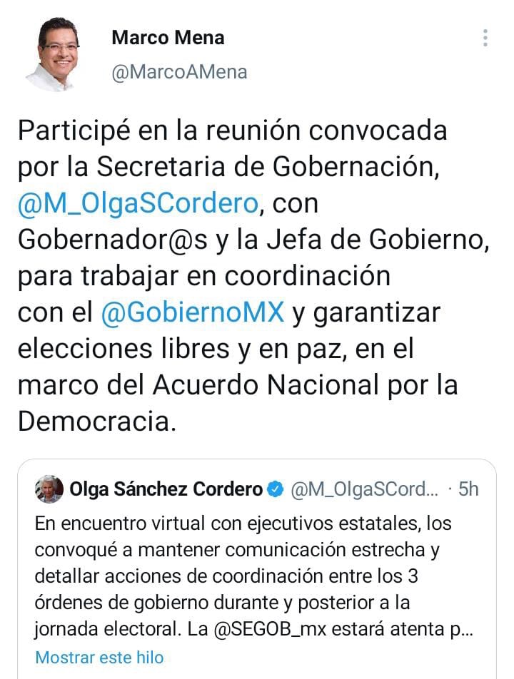 El Gobernador Marco Mena informó, a través de las redes sociales, que participó en la reunión convocada por la Secretaria de Gobernación, Olga Sánchez Cordero, con mandatarios del país y la Jefa de Gobierno de la Ciudad de México, para trabajar en coordinación con el Gobierno Federal y garantizar elecciones, libres y en paz, en el marco del Acuerdo Nacional por la Democracia.