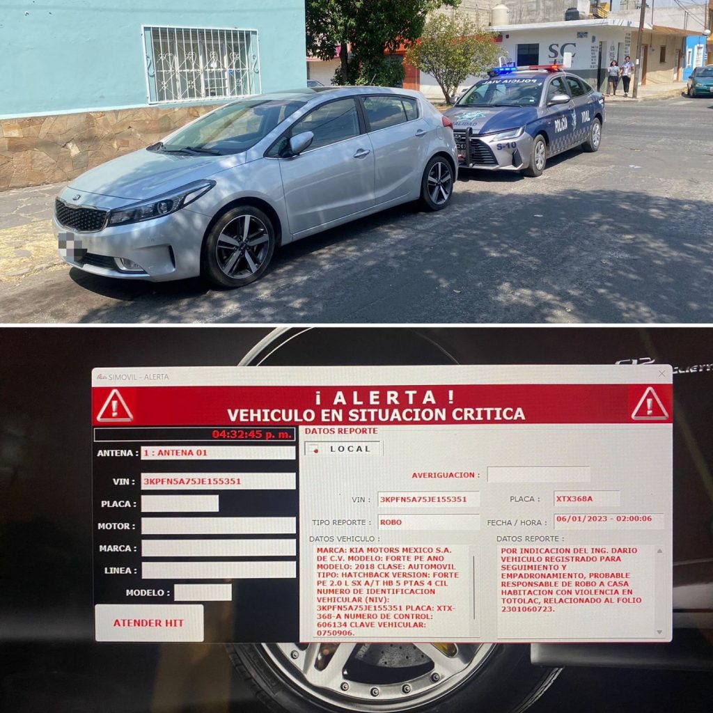 La acción policial tuvo lugar en la intersección de la calle 2 de abril con la Avenida Morelos, donde los oficiales, realizando labores de rastreo y patrullaje equipados con el sistema de monitoreo vehicular móvil del Registro Público Vehicular de Tlaxcala (Repuvet), detectaron un automóvil de marca Kia tipo Forte, color gris, con placas XWJ767D del Estado de Tlaxcala. Este vehículo había sido reportado a través del 911 por su implicación en un robo el 6 de enero de 2023.