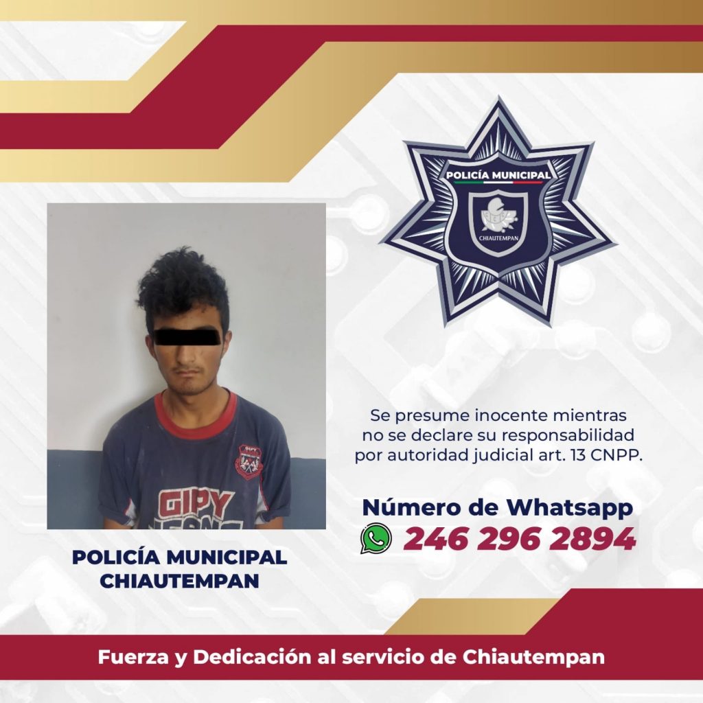 Elementos de la Dirección de Seguridad Pública Municipal, Vialidad y Protección Civil de Chiautempan, detuvieron a un masculino que fue retenido mientras cometía el delito de robo, en la comunidad de Texcacoac.