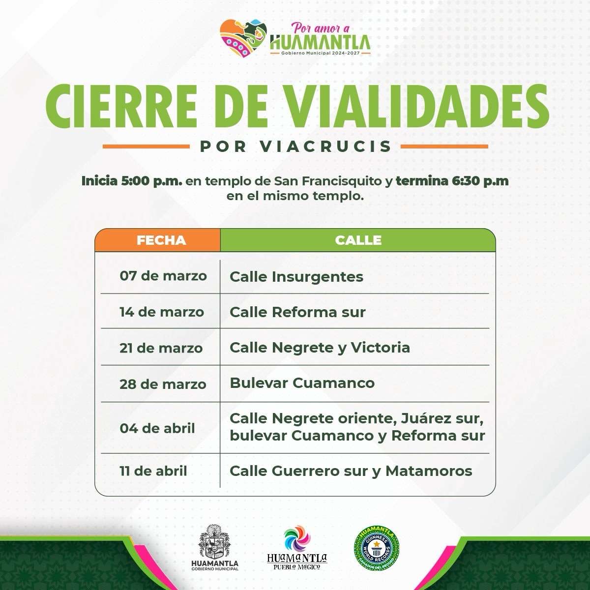 El Gobierno Municipal de Huamantla informa a la ciudadanía sobre el cierre temporal de vialidades debido al viacrucis que se llevará a cabo en el barrio de San Francisquito, el cual tendrá lugar este viernesa partir de las 5:00 pm. en el templo de este lugar y concluirá a las 6:00 pm.