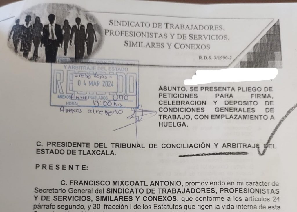 Con este carácter y a través del secretario general del Sindicato, Francisco Mixcoatl Antonio, presentaron la demanda con emplazamiento a huelga como lo prevé la Ley, y tiene como finalidad acordar un documento donde se plasmen sus Condiciones Generales de Trabajo, ya que a la fecha carecen de este contrato fundamental para conocer y regular sus prestaciones que como trabajadores formales de la demandada tienen derecho.