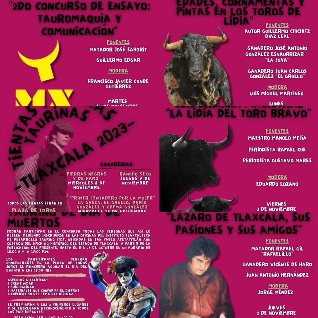 El viernes 3 de Noviembre se realizará la Conferencia Magistral «La Lidia del Toro Bravo» por el matador Manolo Mejía y los periodistas Rafael Cue y Gustavo Mares en el Salón Apizaco del Hotel San Francisco a las 17:30 hrs.