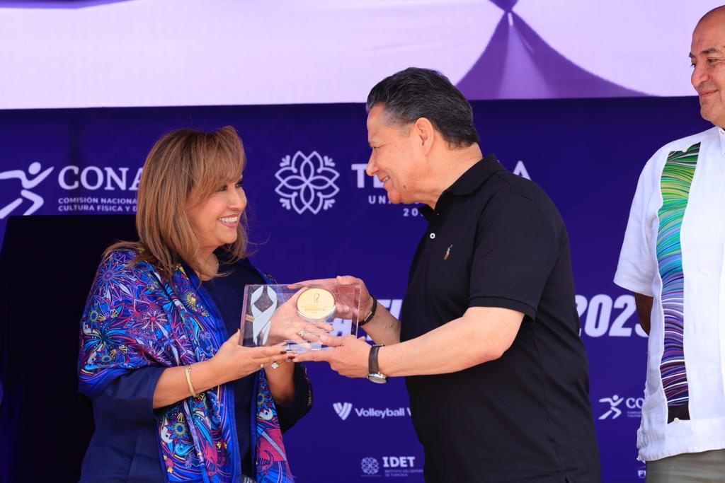 La gobernadora de Tlaxcala, Lorena Cuéllar Cisneros y su homólogo de Hidalgo, Julio Menchaca Salazar, develaron el trofeo que será entregado a los finalistas del Mundial de Voleibol de Playa Tlaxcala 2023, a realizarse del 5 al 15 de octubre.