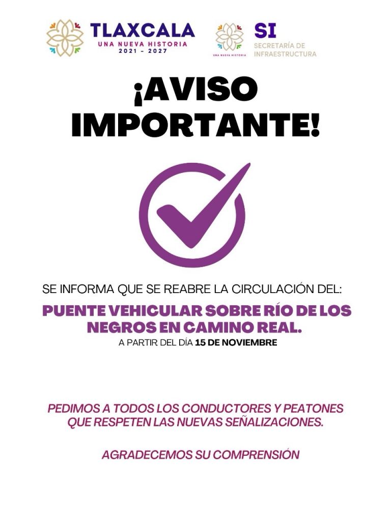 El Gobierno del Estado, a través de la Secretaría de Infraestructura, informa que a partir de este sábado 16 de noviembre se reabre oficialmente la circulación del puente vehicular sobre Río de los Negros en Camino Real, pues aunque se continúa con las labores, la avenida ya está lista para un tránsito seguro; este viernes entró en operación el acceso vehicular.