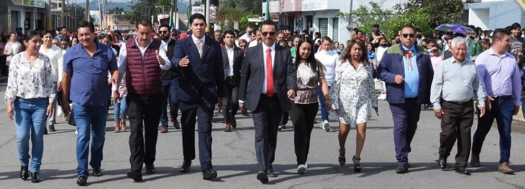 Encabezado por la escolta de la Dirección de Seguridad Pública, cuerpo edilicio y personal administrativo el desfile inició su recorrido por la Av. Principal, hasta llegar a la Plaza del Huehue.