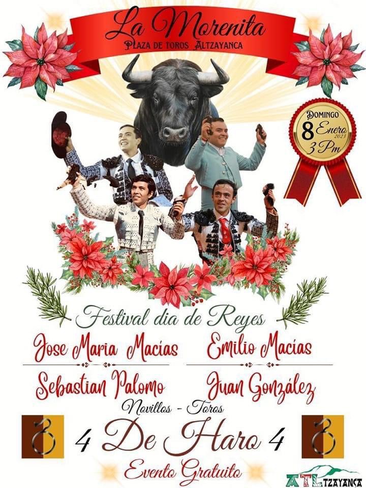 Más tarde a las 15:00 horas en la misma plaza se realizará el “Festival del Día de Reyes”, con la actuación de los toreros José María Macías, Emilio Macías y Sebastián Palomo Macías, así como el novillero Juan González en la lidia de cuatro novillos de la ganadería De Haro.